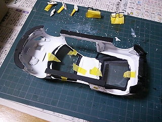 白色ベースで作っているので色合わせが大変です。もちろんステッカーの縁は若干(かなり)色が違ってますね(汗) サイド部分は透明ベースで作っているだめ、若干のりの黄色い色が(汗) リアにも一通りステッカーを貼りました。 ヘッドライトを白、バンパー下部分をマットブラックで塗りましたが、ここへ来て大問題が!! ユーロテールをすっかり忘れてしまっており、もうボディも塗装済みなので塗り分けでどうにか仕上げました。 フロントとリアガラスを木工用ボンドで固定中〜。 ボンネットには金属メッシュを貼りました! |